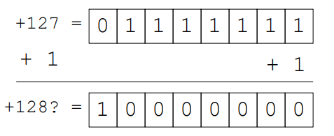 예를 들어16비트(=2바이트)에서 양수의 표현범위는 0111111111111111인데, 1을 더하면 1000000000000000(음수)이 된다. Sign Bit에 1이 있기 때문이다. 따라서 1000000000000001 (=십진수로 -32767) 이 2의 보수로 표현할 수 있는 가장 작은 음수이다. 이보다 더 작은 수를 16비트에서 다루게 되면 언더플로우가 나타난다