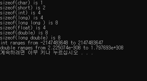 코드를 짤 때 각 자료형이 몇 바이트를 가지는 지를 (1바이트 = 8비트) 출력해보면 다음과 같다. 잘 참고해 오버플로우나 언더플로우가 일어나지 않도록 한다.