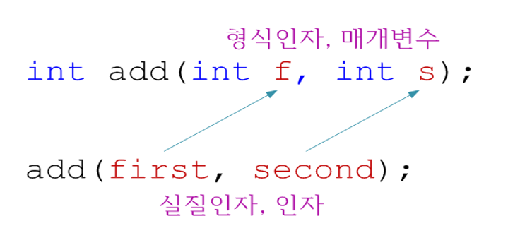 이제 용어들을 정의하자면, 형식인자는 함수를 정의할 때 인풋으로 어떤 형의 값이 들어가는 지 정한다. 매개변수는 인풋과 같으며, 함수를 호출 할 때 괄호 안에 들어가는 값을 실질인자라 한다.