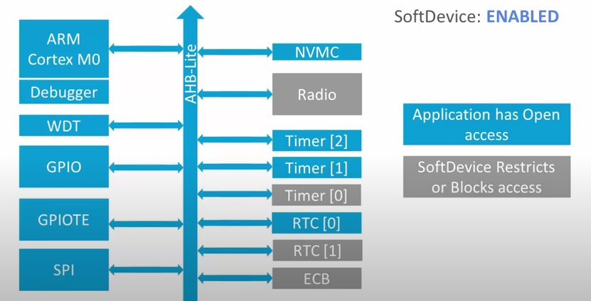SoftDevice 가 Enabled 되면 몇 peripheral은 아래와 같이 액세스가 제한될 수 있습니다. 이는 SoftDevice Specification 문서에서 더 자세히 확인할 수 있습니다.