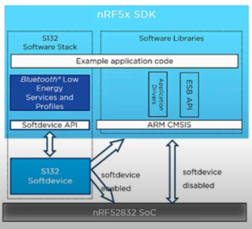 Soft Device는 ANT, BLE 등의 프로토콜 스택을 가지고 있고, 어플리케이션에서 이것의 기능을 사용하려면 API를 통해서만 할 수 있습니다. API는 Supervisor call 기반이며 100% Event Driven 이라고 합니다.