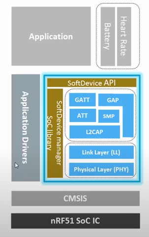 Application Code 는 가장 상단에 위치해 있습니다. Application Code 는 Soft Device를 Soft Device API를 통해 액세스하게 됩니다. 그러면 Soft Device 는 BLE Link를 application을 통해 받은 매개변수를 이용해 적정히 움직입니다.