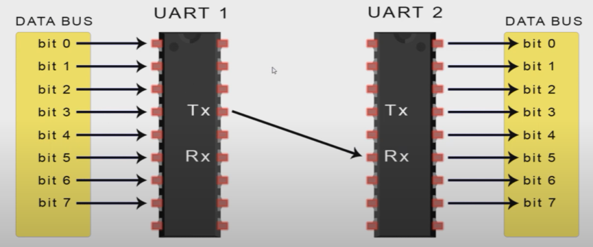 마이크로컨트롤러끼리 UART로 통신할 경우 한 Device의 Tx Pin 이 반대쪽의 Rx 로 연결되고, 반대쪽의 Tx 는 Device의 Rx 로 연결된다. Serial Communication 방식이므로 8개 bit 를 동시에 다루는 Parallel Communication 보다 시간이 약 8배정도 더 걸릴 수밖에 없다.