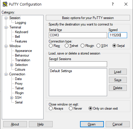 이후 Putty Program을 받고 제어판 - 장치관리자에서 MCU가 COM 포트 몇 번에 입력되어있는지 확인 후 Connecting Type: Serial, Serial Line 과 Speed 설정 후 Open 해준다.
