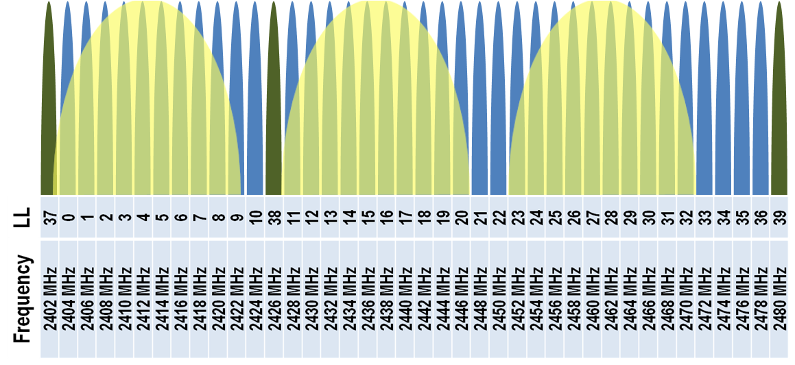BLE는 ISM Band(2.4GHz)에 있는 40개의 RF채널을 쓴다. 이 채널들은 Center Frequency 가 2402 + k * 2 [MHz]로, k 는 0에서 39까지의 값을 가진다. Advertising에 쓰이는 채널은,
