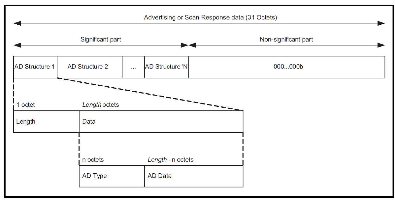 이 때문에 두 가지의 Data Packet이 있다. Packet은 31바이트 Payload까지 가질 수 있으며 advertiser address 는 payload와 함께 broadcasting data라는 큰 틀에 포함된다. 정의된 두 가지의 Data Packet은 다음과 같다