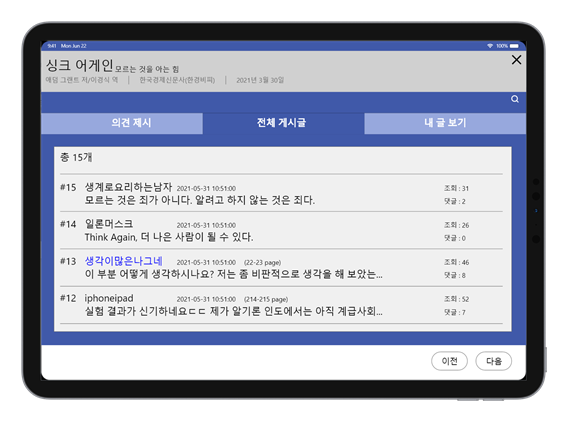 eBook 리더기의 경우 버튼을 눌러 페이지 전환을 하는 방법을 고수하지만, 아이패드를 이용하는 사용자는 아이패드가 eBook리더기처럼 작동하는 것에 익숙치 않을 것이라 생각해 드래그하여 부드럽게 페이지가 움직이는 UI를 일관적으로 제공하는 것이 좋을것이라 생각했습니다.