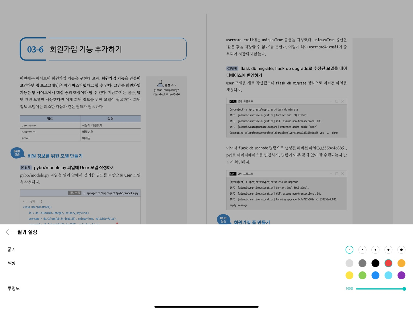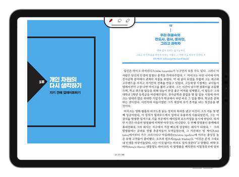 책을 기기로 내려받을 때 ePub 또는 PDF 두 가지로 받을 수 있는데, ePub의 경우 부드러운 페이지 이동이 불가했고 양쪽 화면을 짧게 터치해 페이지 이동을 합니다.