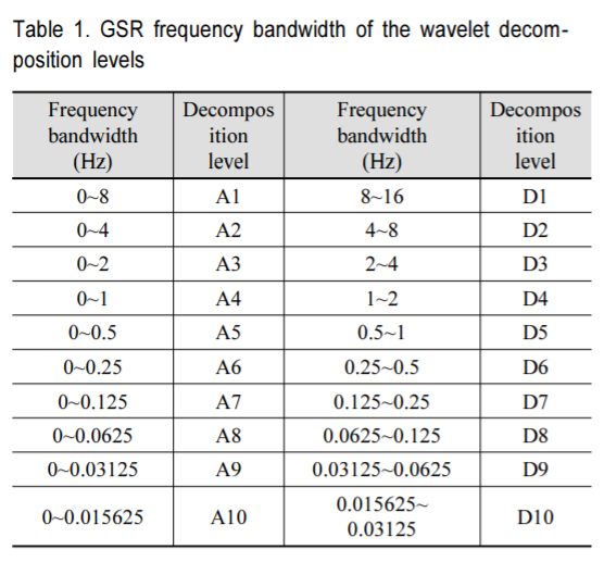논문中 : GSR신호에서 Tonic 성분을 빼줌으로서 Phasic 성분을 계산 ... Phasic 성분의 SCVSR(0-0.08Hz) 는 A8에서 A10을 빼줌으로서 근사적으로 0.016-0.06 Hz로 구성. SCSR신호 (0-0.2 Hz)는 A6에 A10을 빼줌으로 근사적으로 0.016 - 0.25Hz로 구성