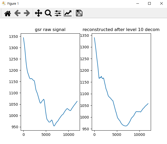 이와 같은 방법으로 Raw GSR Signal에서 A10 Reconstructed(after detail coefficients zeroed out) 를 빼주어 Phasic을 구하면 다음과 같은 결과를 얻게 됩니다.