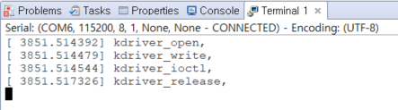 Terminal에서 Terminal Settings 선택 후 COM Port 를 확인하고 Connect 합니다. 이후 kdriver를 다시 컴파일 하면 터미널에 성공 메시지가 뜨게 됩니다.