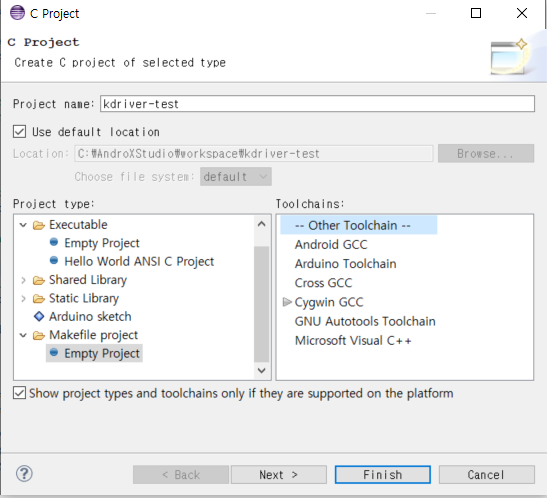 kdriver를 만들었는데 이것이 제대로 작동하는지 확인하기 위한 테스트를 하여야 합니다. 새로운 C Project를 준비합니다.