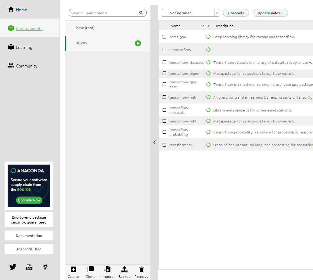 아래의 'create' 메뉴를 이용해 새로운 가상환경을 만들어줍니다. 저의 경우 ai_env 라는 이름으로, Python 버전은 3.9로 설정하였습니다.