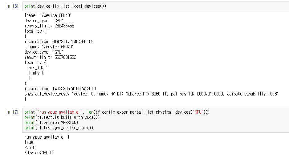 코드상으로 tensorflow가 GPU를 인식하는지 (cuDNN이 제대로 설치되어 있다면) 확인 후, CPU대비 GPU의 성능 차이를 시간을 찍어 확인합니다.