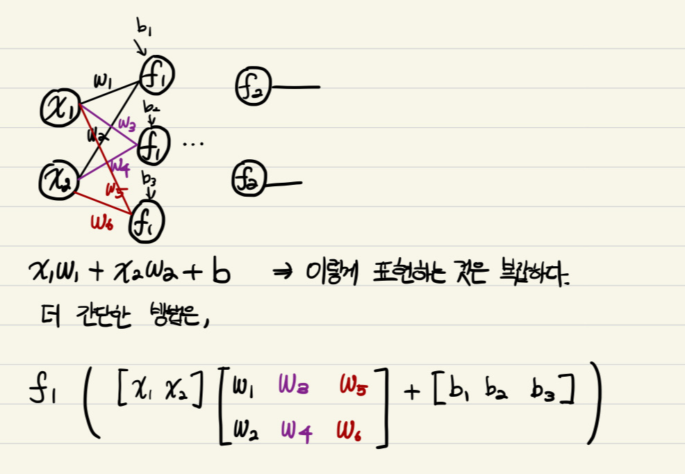 함수 f 로 감싸는 이유는 weight를 통과하고 activation 함수에 들어가기 때문입니다. 이를 통해 multi layer perceptron(MLP)는 행렬곱, 벡터합, activation함수 통과의 반복임을 알 수 있습니다. 이전에 activation 통과한것에 weight를 곱하고 bias를 더하며, 다음 activation 함수를 통과시켜줍니다.