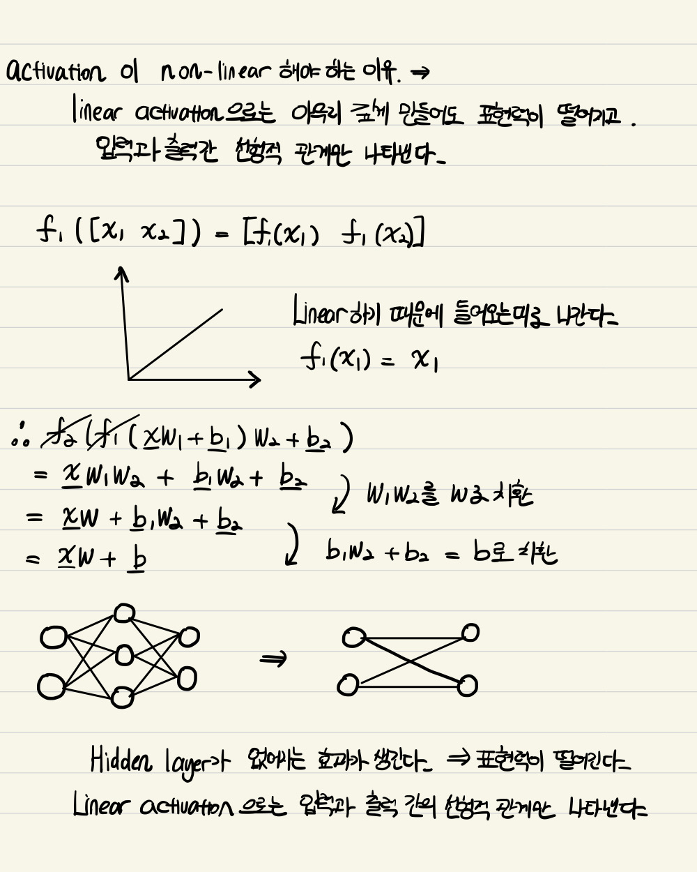 Linear activation이 사용되었다고 하면, activation function을 무시하고 전개를 진행해도 무방합니다. 따라서, 중간에 있는 hidden layer가 무시되는 효과를 가집니다. 아래 필기에 수식적으로 설명되어 있습니다.
