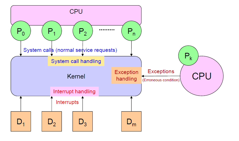 Kernel 은 여러 객체에 의해 신호를 받는다. 신호를 주는 객체는 크게 CPU, peripheral device 두 가지로 나뉘는데, CPU에서 주는 신호는 정상적인 로직을 수행하기 위한 신호인지, 문제상황에 들어오는 신호인지에 따라 system call과 exception으로 나뉜다. Peripheral device 에서 들어오는 신호는 interrupt로, 우리가 지금 사용하는 키보드와 마우스, SSD 등이 interrupt 방식으로 작동한다. 임베디드시스템에서의 인터럽트와 유사한 맥락이지만 kernel에 구현된 interrupt handling은 더욱 정교하고 복잡하다.
