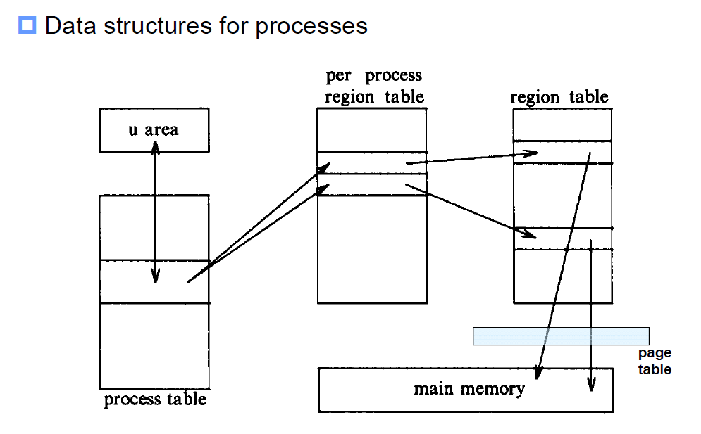 Process 관리를 위한 자료구조에 대해서도 알아본다. Process의 context 가 main memory에 들고, virtual memory system을 사용한다면 region이 조각날 수도 있다. 이 조각들 각각의 단위는 page라고 한다. 이 경우 page table을 사용하여 page 단위로 나누어 memory에 할당하고 관리하는데 이것의 역할은 virtual address를 real address로 변환해주기 위한 address mapping table 이다.