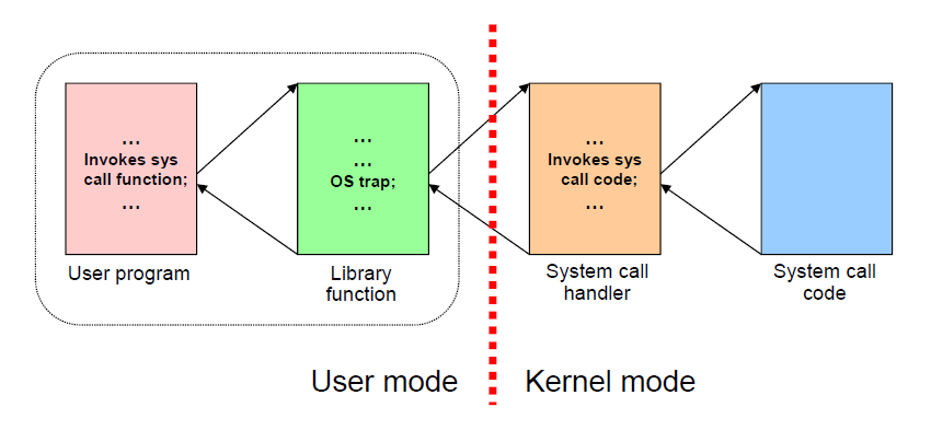 특정 system call number 가 register에 넣어져 system call 이 호출될 시 library 함수가 실행되다가 trap을 건다. 이는 software interrupt 와 같은 개념이다. 이후 CPU가 하드웨어적으로 kernel mode로 바뀌며 trap에 의해 system call handler가 실행된다.