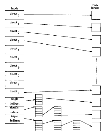 Unix File System에서는 direct block 10개, single indirect 1, double indirect 1, triple indirect 1개가 있습니다. Unix 에서는 inode 하나의 크기가 64 byte 였고, 여러 inode에 들어가는 12 byte를 제외한 52 byte에 13개의 file data의 위치와 관련된 정보가 들어갔습니다.