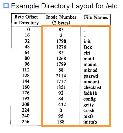 우선, 파일 시스템에서 디렉토리 파일과 pathname 에 관해 알아보겠습니다. 파일시스템에서 파일들은 hierarchical structure를 가지게 되고 이것은 directory라는 개념이 존재하기 때문에 가능합니다. 윈도우에서 '폴더'라고 불리는 것이 그것이죠. Directory는 inode number와 file name entry를 가지는 table로 구성되어 있습니다. Empty directory entry 는 inode number가 0으로 표시되어 있습니다.