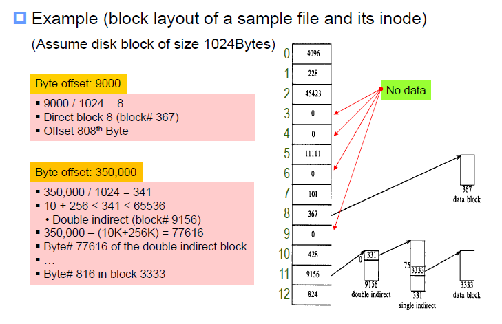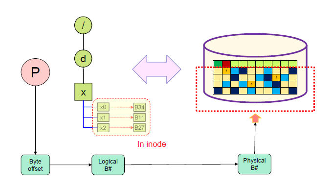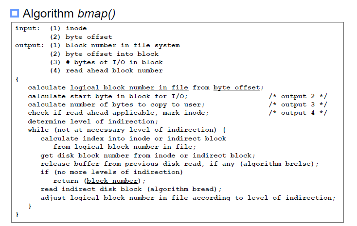 '/d/x는 Root 밑 d directory 밑 file x를 뜻하는데, file x의 block 크기를 통해 우리는 offset이 무슨 logical block에 해당하는지 알 수 있습니다. 예를 들어 1개의 block size가 1KB = 1024B라면, offset=1000 인 경우, 0번 logical block임을 알 수 있습니다. 여기서부터는 inode를 참고하여 physical block number까지 알아냅니다. 아래에 pseudocode 로 설명되어 있습니다.
