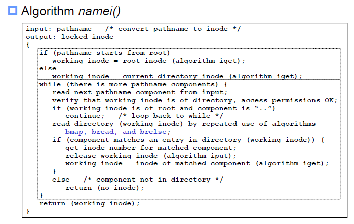 전체 파일 시스템 안에서의 search는 여러 어플리케이션을 만들 때 필요합니다. Pathname이 주어지면 파일을 접근하는 알고리즘이 namei() 입니다. 아까 bmap은 파일이 주어졌을 때 그 안에서 필요한 데이터가 담긴 physical disk를 가져오는 역할을 했다면, 이 알고리즘은 더 큰 범위에서 필요한 pathname이 있다면 그것에 해당하는 파일을 가져오는 역할을 합니다. 이것이 가능하려면 우선은 pathname을 해당 파일의 inode로 변환할 것입니다.