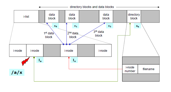 a라는 파일로부터 시작합니다. a가 처음에 directory인지 regular file인지 커널에서는 아직 알지 못합니다. inode를 읽는데, 13개의 pointer를 참조하며 directory block을 하나씩 읽어보며 우리가 원하는 x라는 파일이 있는지 block을 하나씩 들어내서 찾아봅니다. x라는 파일이 나왔다면 그것의 inode 번호를 directory에서 찾아봅니다. inode 번호를 가지고 iget()을 실행합니다. 그렇게 하면 해당 inode가 in-core(memory)로 읽혀 들어오는데 그 안에서 13개의 pointer (hybrid multilevel indexing 기법)으로 필요한 data block을 모두 얻어낼 수 있습니다.