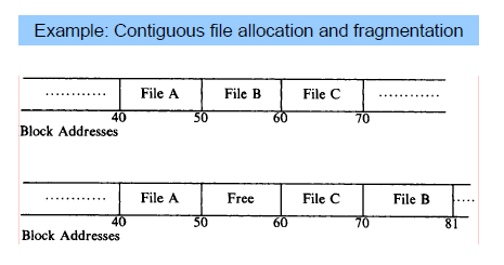 파일의 데이터를 연속적으로 저장해야 하는 policy를 적용한다면 아래 File A, File B, File C 가 나란히 있는데 File B의 크기가 더 커지는 상황을 마주하여 C를 옮기거나 B를 옮겨야 하는 이슈가 발생합니다. 나란히 저장해야 한다는 policy에 의해 C를 옮기고 B를 증대시키는 방식은 memory bandwidth를 높일 뿐 아니라 중간에 빈 공간이 만들어지는 fragmentation 문제가 발생합니다.