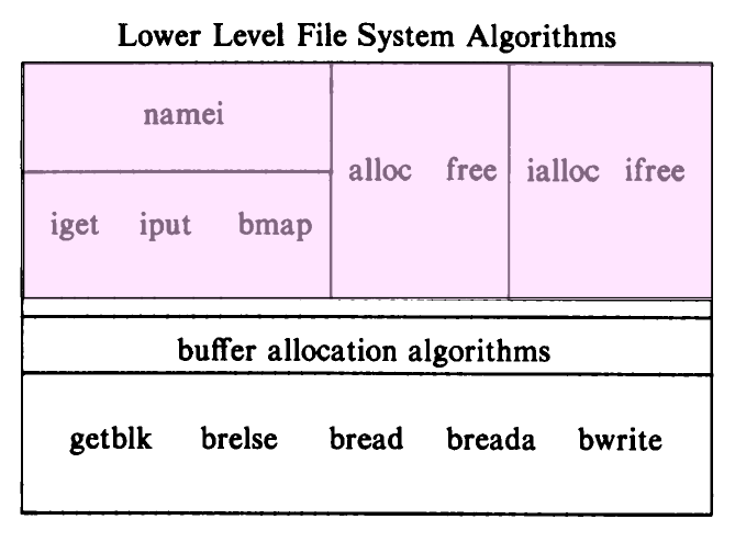 위 그림에서 계층상으로만 보면 namei()가 bmap()보다 상위에 있는 것을 볼 수 있습니다. namei()가 bmap()을 호출한다는 뜻이 됩니다. bmap()뿐 아니라 iput(), iget()도 포함됩니다.