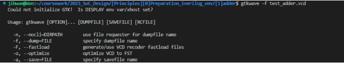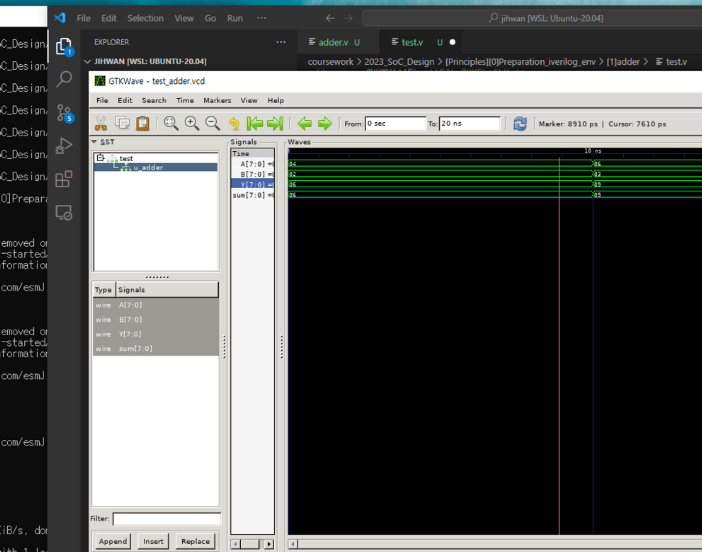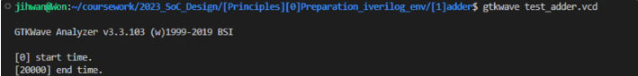 다시 gtkwave를 실행시킨다. 이전에 a.out 을 실행시켜 만들어낸 test_adder.vcd 로 진행합니다.