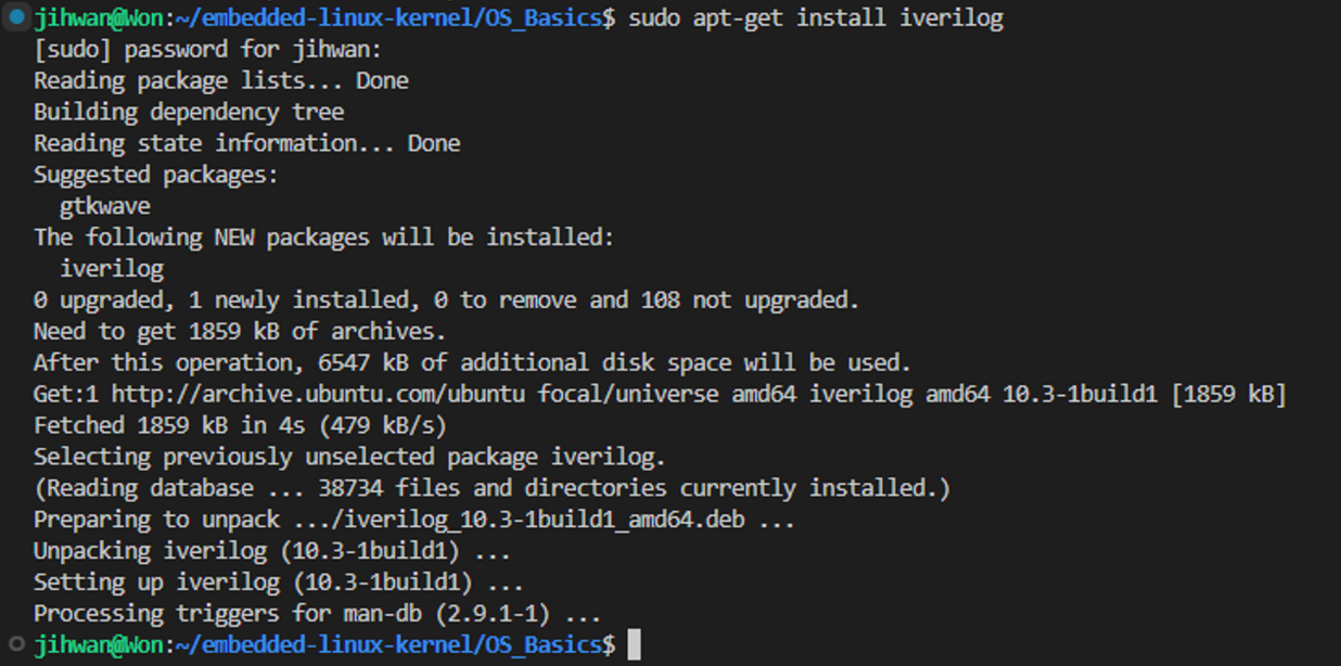 iverilog는 Verilog 컴파일용 오픈소스 툴. 다음 명령어로 설치를 진행합니다.